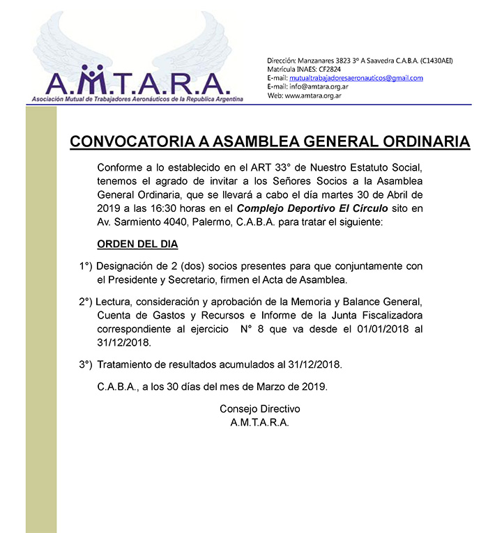 CONVOCATORIA A ASAMBLEA GENERAL ORDINARIA