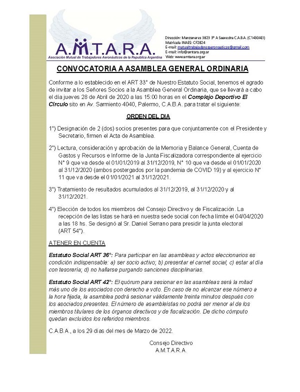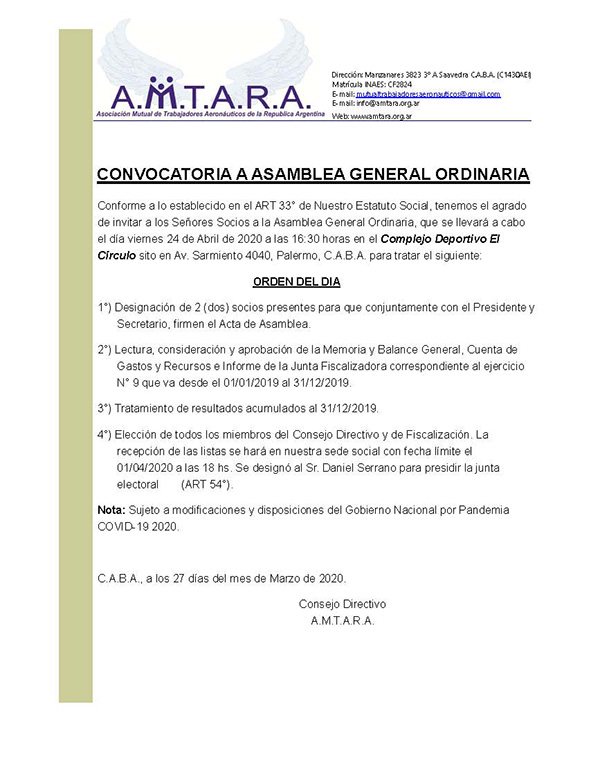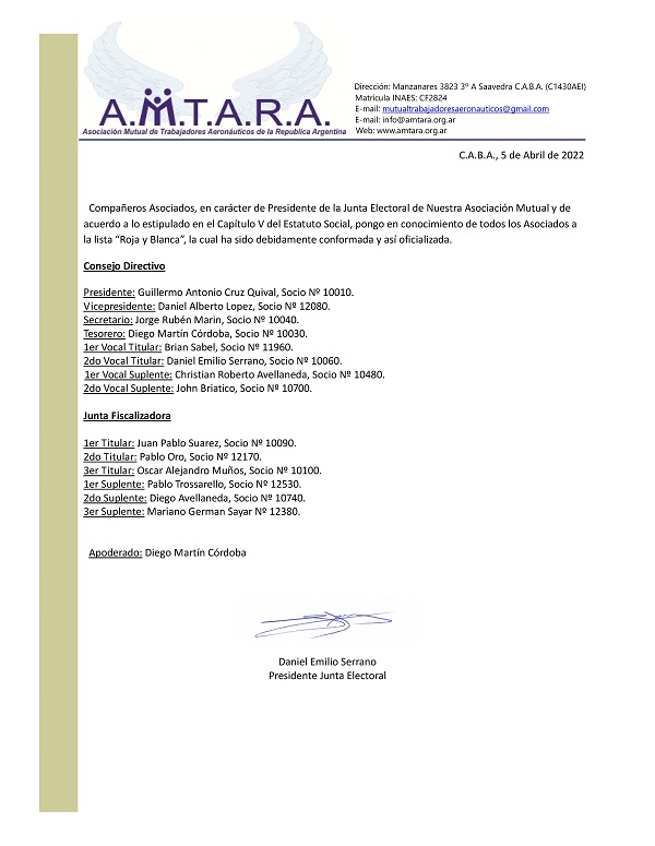 Por lo expuesto, el Consejo Directivo de la Asociación Mutual de Trabajadores Aeronáuticos de la República Argentina (A.M.T.A.R.A.) dispone que articulará todos los medios que sean necesarios para evitar ésta clara desestabilización del Sector Aeronáutico que se produciría de concretarse lo arriba expuesto y redoblará esfuerzos para continuar trabajando con LAN ARGENTINA S.A. y con las demás empresas para el desarrollo del Sector.